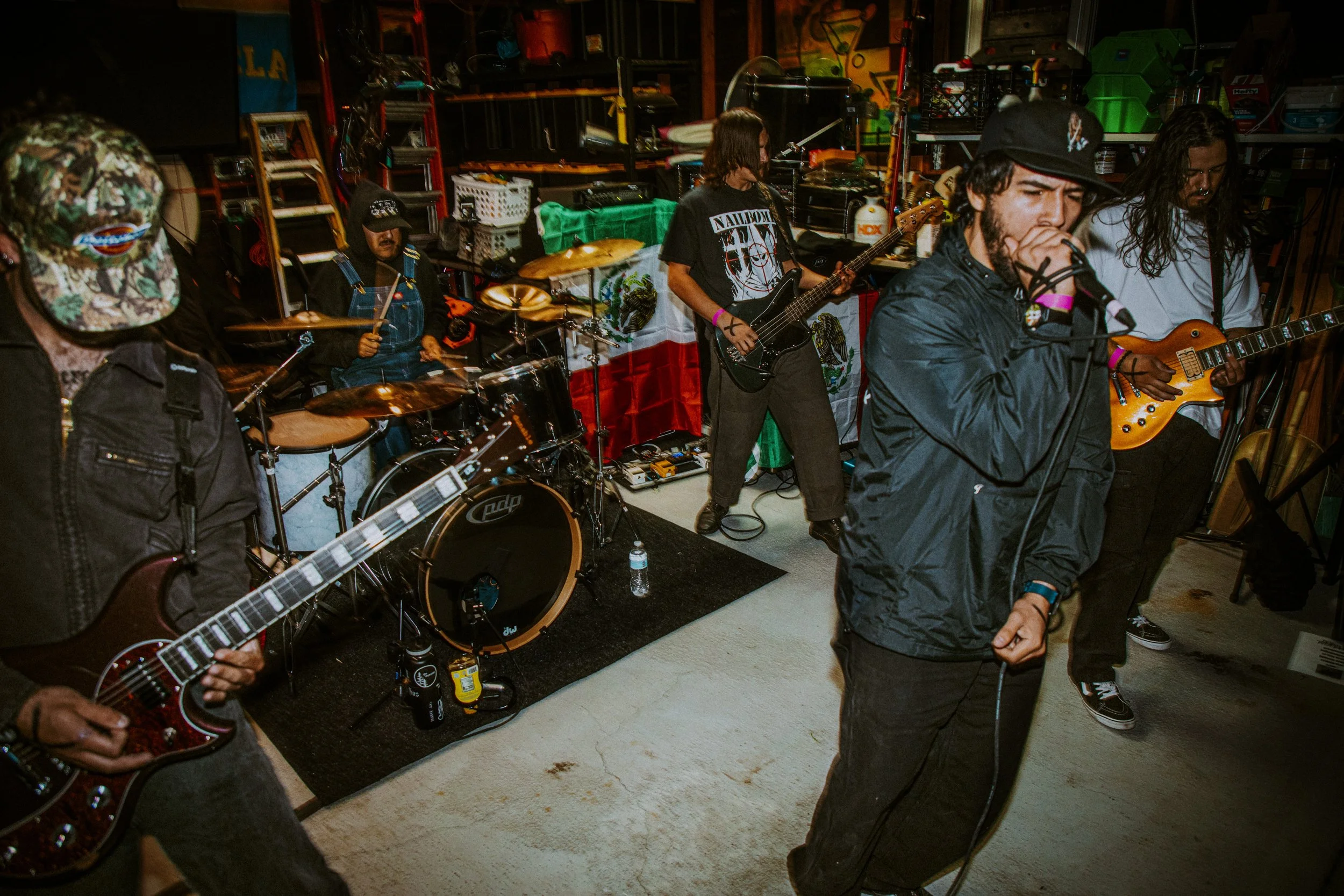 For their name, the group wanted something that reflected the Christian themed Mexican identity in the music. They felt that Amor De Dios, meaning “Love of God,” was perfect. Amor De Dios began when vocalist Blake and guitarist Mateo started collaborating at Mateo’s place, trading riffs and developing ideas rooted in their shared influences. Mateo handles all of the instrumental composition and guitar work, while Blake focuses on writing lyrics and shaping themes. As Blake described it, the band’s origin is “the classic story of a couple of friends who wanted to make music together—getting together in a garage type beat.” The remaining members—Andrew (guitar), Jacob (drums), and Don (bass)—were friends the duo met through the hardcore scene and later brought into the project to round out the lineup.